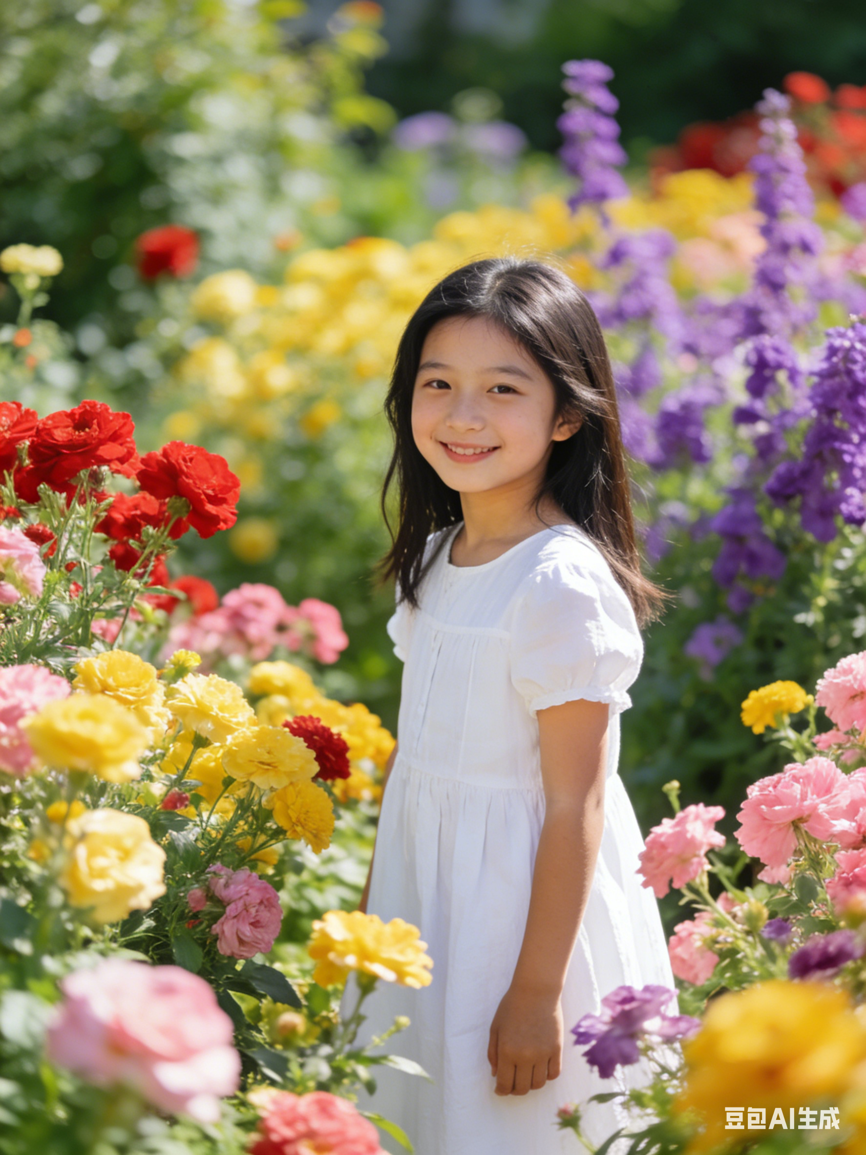 请生成一张名为“花丛中的女孩”的图像:明媚的阳光下,一个身穿白裙子的女孩站在花丛中 |