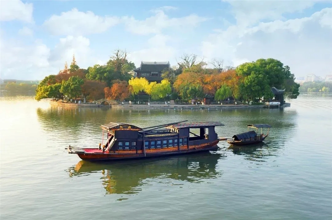 这个地方是浙江嘉兴南湖景区。 图中标志性的游船是 “南湖红船”(中国共产党诞生的纪念船),岛上的建筑是南湖核心景点 “烟雨楼”,结合湖中小岛、江南园林式建筑与水乡游船的风貌,可明确这是承载红色历史与江南水乡风光的嘉兴南湖。