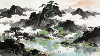 画面缓缓展开,首先映入眼帘的是一座巍峨挺拔的主峰,它矗立于画面中央偏上位置,山峰层峦叠嶂,云雾缭绕其间,仿佛是天与地的交界,既神秘又庄严。山 峰之上,古松苍翠,枝干虬曲,展现出顽强的生命力。它们或立于峭壁之上,或隐于云雾之间,为这静谧的山林增添了几分生气。 随着视线下移,一条蜿蜒曲折的溪流从山间潺潺流出,溪水清澈见底,倒映着两岸的青山绿树,以及天空中飘浮的几朵白云。溪边,野花烂漫,彩蝶飞舞,一片 生机勃勃的景象。溪流旁,隐约可见几处亭台楼阁,它们或依山而建,或临水而居,与自然景观融为一体,彰显出古代文人雅士追求自然和谐的生活态度。 在画面的远处,群山连绵,云雾缭绕,形成了一幅幅动人的水墨画卷。这些远山虽不及主峰那般雄伟,却以它们独特的姿态和色彩,为整幅画面增添了层次感和 深度。同时,远处的天空也被染上了淡淡的墨色,与群山相呼应,营造出一种宁静而深远的氛围。 整幅画面以墨色为主,辅以淡彩,通过浓淡干湿、疏密曲直的笔墨技法,将中国山水画的意境之美展现得淋漓尽致。观者仿佛能够穿越时空,置身于那片古老而神秘的山水之间,感受那份来自心灵深处的宁静与和谐。 |