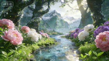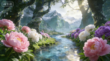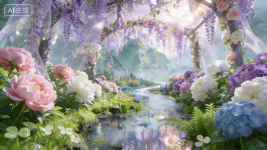 梦幻森系风景摄影,一片藏在山谷中的绣球花海,各色绣球花簇拥绽放,蓝紫、粉白、浅蓝的花球挨挨挤挤,饱满圆润。花海旁有一条蜿蜒的木质小径,两旁生长着高大的香樟树,树干上缠绕着淡紫色的紫藤花,垂落的花穗如瀑布般倾泻而下。空气中弥漫着花香,蝴蝶在花丛中翩跹起舞,阳光透过枝叶洒下斑驳的光影,画面浪漫唯美,宛如童话秘境。 |