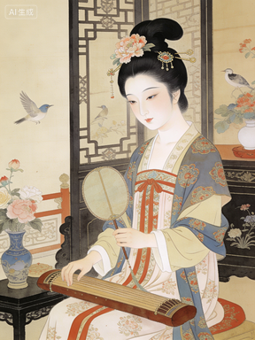 唐代工笔仕女图,画面主体是一位身着襦裙的仕女,发髻高挽,插金步摇与玉簪,鬓边簪一朵粉白牡丹。面容丰腴秀美,柳叶眉弯弯,丹凤眼含情,鼻梁小巧,唇点朱红,神情温婉娴静。身穿大红色印花襦裙,外罩半透明披帛,披帛上以淡青、粉色绘缠枝莲纹,随风轻飘。仕女侧身而立,右手轻执一把团扇,扇面上绘水墨兰草,左手自然垂落,指尖轻触身前的白玉兰花瓣。背景是古朴的雕花屏风,屏风后隐约可见庭院中的芭蕉叶与太湖石,地面铺浅色地毯,点缀几只瓷瓶,插着初绽的花枝。整体设色艳丽华贵,线条流畅细腻,尽显唐代仕女的雍容典雅。 |