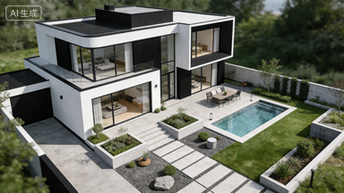 现代轻奢时尚独栋住宅建筑摄影,建筑主体为白色极简风格,搭配深灰色金属窗框与浅棕色木纹外墙,线条利落干脆。一层采用全玻璃幕墙设计,连通室内与庭院,二层设大面积悬挑露台,搭配玻璃护栏,保证通透感。屋顶设计为平顶 + 局部坡顶,预留太阳能安装位与空中花园空间。庭院内种植草坪、花境与高大乔木,搭配户外休闲座椅与小型水景,入口处设简约金属大门,门前铺装几何图案石板路。整体建筑造型时尚大气,功能分区合理,兼具私密性与观赏性,符合现代高端家庭的居住需求。 |