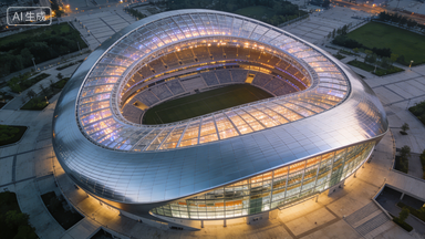 超现代恢弘体育场建筑摄影,整体采用流线型穹顶设计,跨度巨大的钢结构搭配通透的双层玻璃幕墙,银色金属面板在阳光下反射出冷冽光泽,宛如悬浮于城市之上的未来飞船。场馆外立面以渐变蓝紫色 LED 灯带勾勒轮廓,夜间点亮后形成震撼的光影特效。入口处设 8 组巨型弧形立柱,支撑起挑高 20 米的门廊,彰显磅礴气势。周边配套大面积绿化广场、露天喷泉与生态停车场,整体布局对称规整,既满足赛事功能需求,又兼具艺术观赏性,尽显国际级体育场馆的恢弘风范。 |