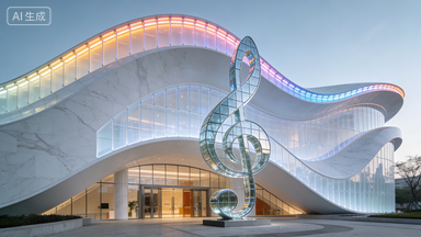 极简主义时尚音乐厅建筑摄影,主体造型采用 “流动的声波” 设计理念,白色曲面混凝土外墙线条流畅,如凝固的音乐旋律,局部嵌入通透的玻璃幕墙,形成虚实对比。建筑顶部覆盖大面积太阳能板,兼具环保与科技感,两侧延伸出的弧形挑檐如翅膀般舒展,增强视觉张力。入口处设巨型玻璃旋转门,门前矗立 3 组金属材质的抽象音符雕塑,与建筑主题呼应。周边环绕着镜面水景与线性绿植带,水面倒映建筑轮廓,营造出静谧优雅的艺术氛围,整体风格时尚前卫又不失人文气息。 |