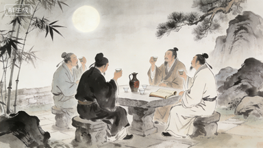 写意水墨古代文人图,画面描绘四位文人在山间竹亭中把酒吟诗的场景。竹亭为简约的木质结构,四面通透,周围环绕着挺拔的翠竹,竹叶以浓淡墨色点染,疏密交错。四位文人身着宽袍大袖,衣纹以简练的线条勾勒,或坐或立,姿态闲适。左侧文人手持书卷,低头吟诵;中间两人相对而坐,面前石桌上摆放着酒壶、酒杯与笔墨纸砚,一人举杯邀月,一人挥毫泼墨;右侧文人凭栏远眺,目光望向远方的明月与远山。背景以淡墨渲染夜空,一轮圆月高悬,云雾轻柔,山下有潺潺溪流,山石以斧劈皴法表现。整体笔墨洒脱自然,色调清雅,氛围悠然自得,尽显古代文人的风雅与诗意。 |