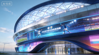 一座流线型设计的现代化体育场馆,外面采用银色与深蓝色的金属材质,在阳光下闪耀着未来科技的光芒。巨大的穹顶采用透明材料,自然光与内部LED照明交 相辉映,营造出既明亮又梦幻的空间感。场馆外立面装饰着动态变化的LED屏幕,正播放着赛事预告及与观众互动内容,展现着现代体育的活力与魅力。入口处, 流线型的玻璃门与智能识别系统融为一体,彰显着科技与便利的完美结合。 |