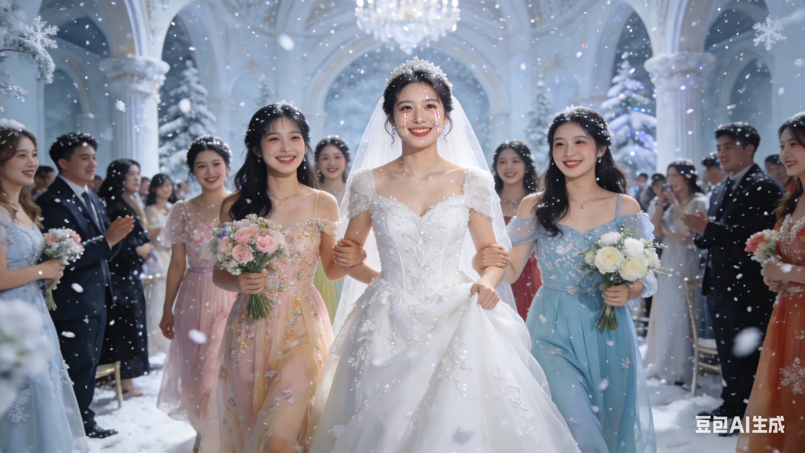 示例:梦幻般的婚礼殿堂内,新娘身着洁白的婚纱,宛如雪天中的仙子,眼眸中闪烁着幸福的泪光。她的笑容温柔而灿烂,每一步都散发着优雅与喜悦。伴娘们环绕在新娘身旁,身着各式精致礼服,色彩斑斓却和谐统一,她们的笑容纯真无邪,为这场婚礼增添了更多的温馨与欢乐。新娘与伴娘们手挽手,步入婚姻的殿堂,周围是亲朋好友的祝福与见证,空气中弥漫着爱的芬芳。 |