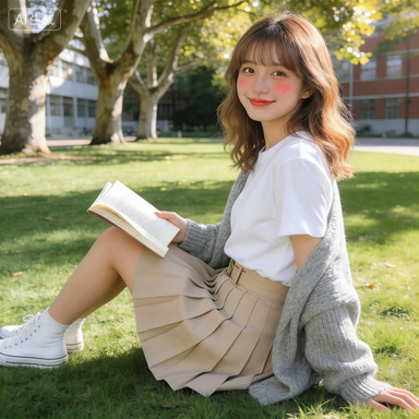 日系清新风格人物摄影,主体是 16 岁元气少女,梳着蓬松高丸子头,碎发自然垂落鬓角,额头点缀细碎刘海。身穿白色短袖水手服,搭配藏青色百褶裙,脚踩白色帆布鞋。少女坐在校园樱花树下,手里拿着一支草莓味甜筒,嘴角上扬露出小虎牙,眼神灵动明亮。背景是飘落的粉色樱花瓣,柔和自然光洒在身上,画面色调清新柔和,充满青春活力感。 |
