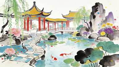 青绿山水风格古代园林国画,画面采用俯瞰式构图,展现园林 “一池三山” 的经典布局。中央是澄澈的荷花池,粉白荷花亭亭玉立,荷叶以花青、赭石晕染,露珠晶莹。池边蜿蜒的九曲石桥连接着湖心亭,亭台为朱红立柱、黛瓦飞檐,亭内有文人雅士凭栏远眺。园林四周是白墙黛瓦的轩榭廊坊,雕花窗棂古朴雅致,廊下悬挂红灯笼。园内种植松、竹、梅、柳等绿植,山石堆叠成假山,山间有潺潺流水,小径蜿蜒穿梭于草木间。远处以淡墨渲染远山,云雾缭绕,整体色调清雅明快,笔墨细腻,尽显古典园林 “虽由人作,宛自天开” 的雅致意境。 |