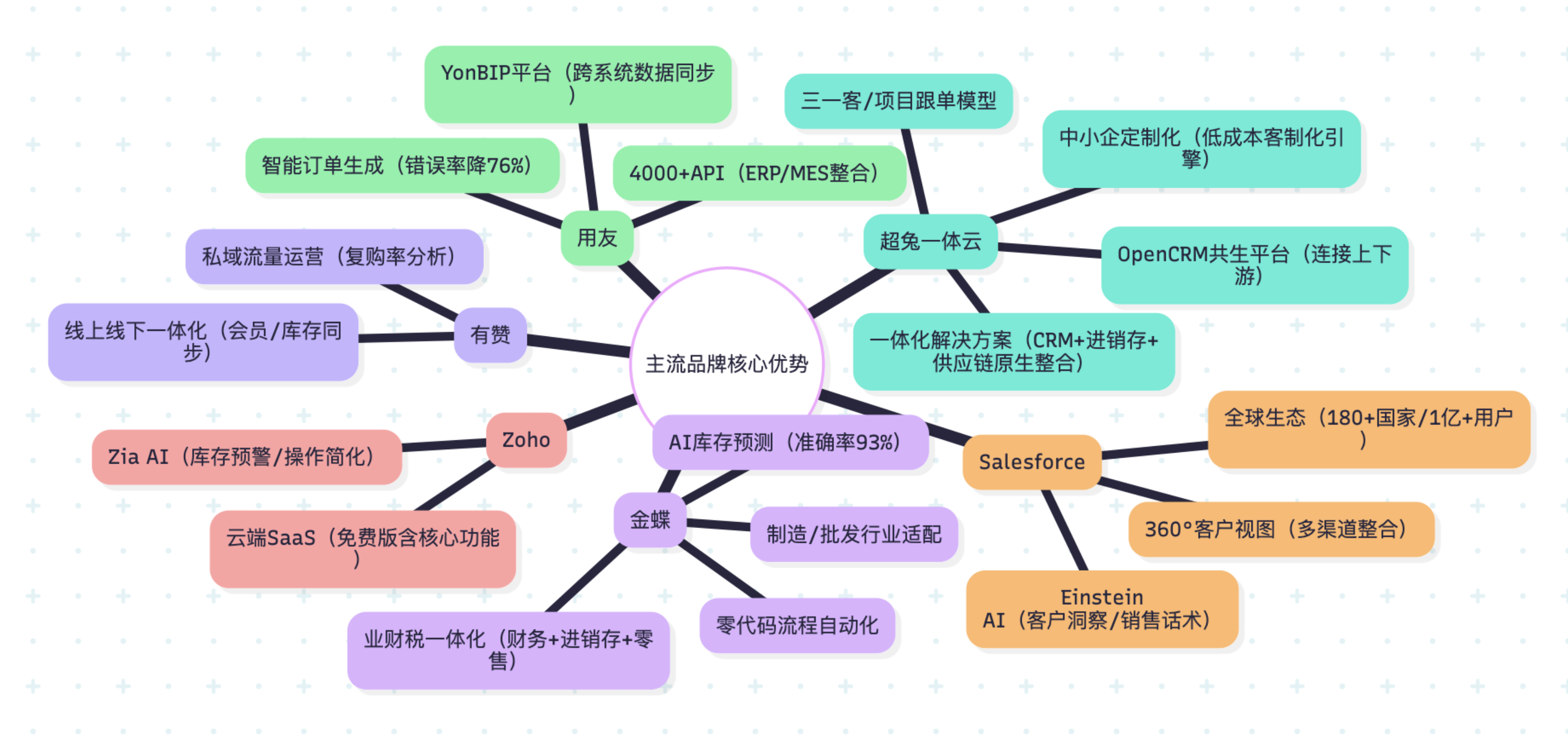 在企业数字化转型进入“深水区”的今天,单一CRM工具已无法满足全链路需求——企业需要的是“CRM管客户、销售管流程、进销存管库存、供应链管协同”的一体化解决方案。本文选取超兔一体云、Salesforce、SAP、金蝶、用友、Zoho、有赞等17个主流品牌,围绕CRM管理、销售管理、进销存、供应链四大核心维度展开深度横评,结合专业指标、流程架构与场景适配性,为企业选择提供参考。
