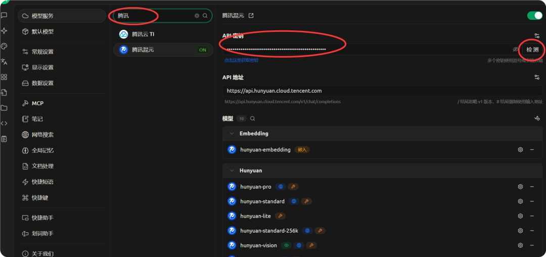 点击设置,模型服务,搜索“腾讯”,选择腾讯混元