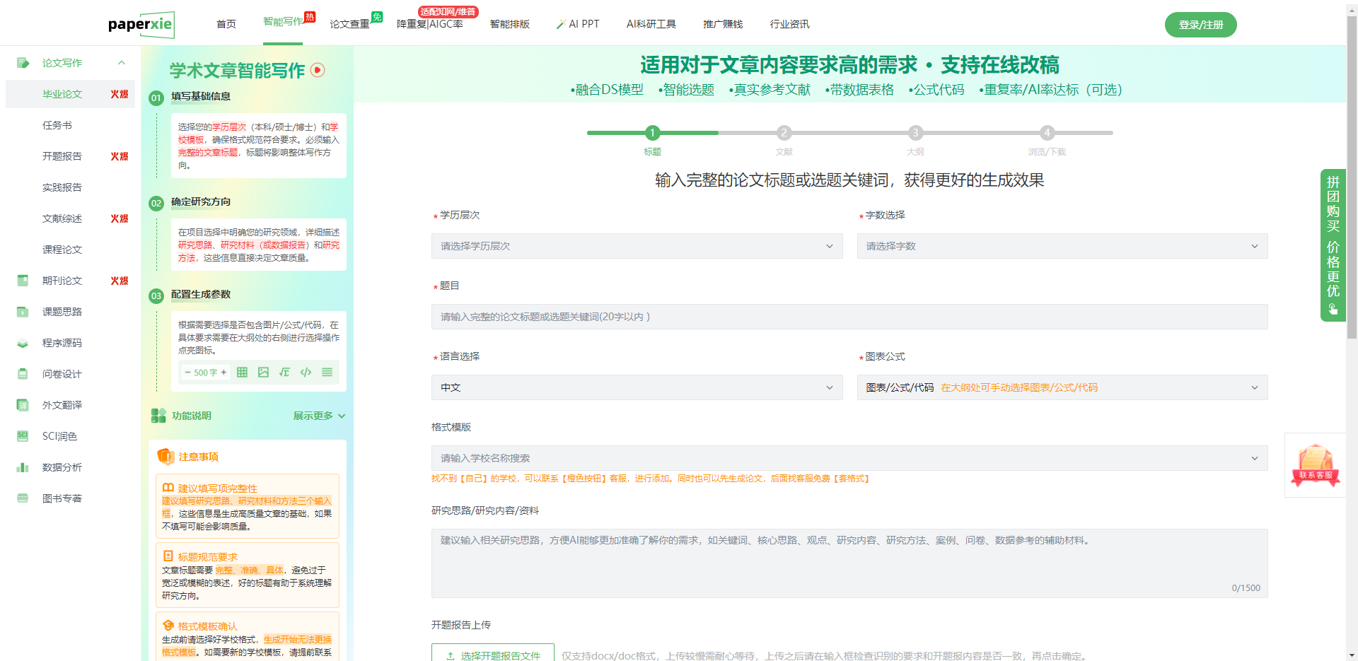 - 附加价值:提供免费客服格式套用、开题报告续写、智能选题推荐等“人机协同”服务。