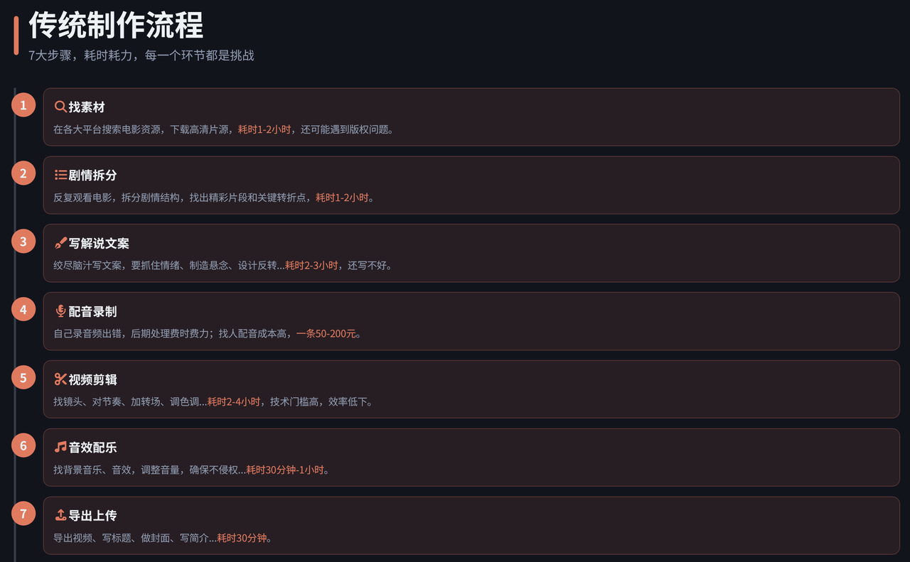 👉 一条合格的电影解说视频,往往需要 3–5 小时起步。这也是为什么很多人坚持不到 30 条就放弃。
