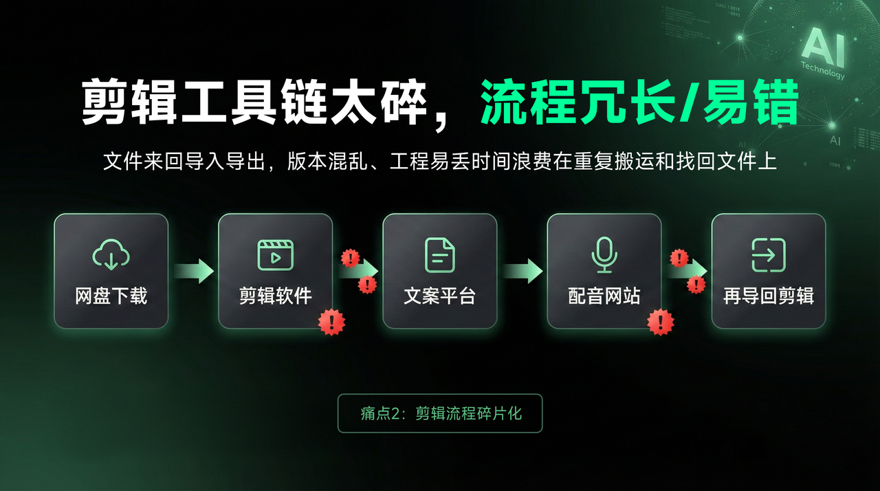 3️⃣ 剪辑配音阶段:技术门槛 + 重复劳动