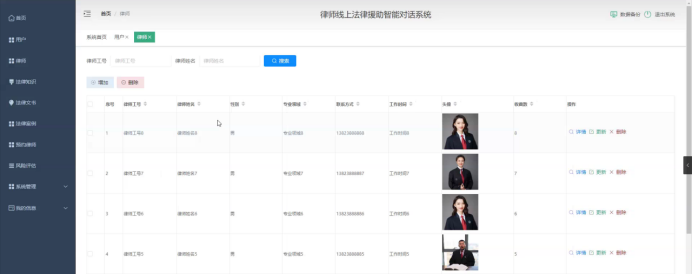 律师功能在视图层(view层)进行交互,比如点击“搜索、增加或删除”按钮或填写律师表单。这些律师表单动作被视图层捕获并作为请求发送给相应的控制器层(controller层)。控制器接收到这些请求后,调用服务层(service层)以执行相关的业务逻辑,例如验证输入数据的有效性和与数据库的交互。服务层处理完这些逻辑后,进一步与数据访问对象层(DAO层)交互,后者负责具体的数据操作如详情、更新或删除律师信息,并将操作结果返回给控制器。最终,控制器根据这些结果更新视图层,以便律师功能可以看到最新的信息或相应的操作反馈。律师界面如图5-13所示: