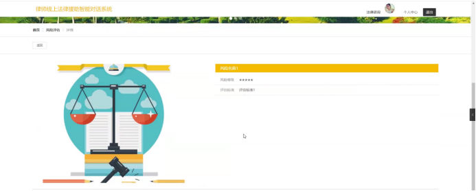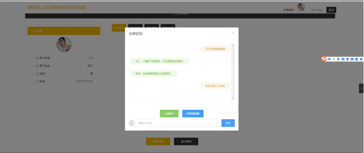 法律咨询:法律咨询为用户提供了一个全面、便捷、高效的法律交互平台。管理员在后台精心构建和维护一个包含广泛法律知识点的问题库,这些问题覆盖了从民事、刑事到商业、劳动等多个法律领域,旨在满足不同用户在不同情况下的法律咨询需求。在后台管理过程中,管理员不仅负责收集和整理各类法律问题,还需要根据最新的法律法规变动、司法解释和实践案例,定期更新和完善问题库中的内容。这样做的目的是为了确保系统提供的信息不仅准确无误,而且紧跟时代步伐,满足用户对时效性的需求。用户在使用该系统时,只需通过前台界面输入他们所关心的法律问题,无论是合同纠纷、知识产权保护,还是婚姻家庭、劳动争议等问题,智能客服系统都能迅速识别问题的关键点,并在庞大的数据库中检索出最相关、最匹配的答案。系统不仅提供标准答案,还能根据问题的复杂性,给出进一步的法律建议或指导用户如何采取合适的法律行动。此外,该系统还具备一定的交互能力,能够根据用户的进一步询问,提供更加详细和个性化的法律解答。这种智能化的交互体验,使得用户仿佛在与一位专业律师进行面对面的咨询,大大提高了用户的满意度和信任度;法律咨询页面如图5-9所示: