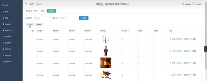 法律知识功能在视图层(view层)进行交互,比如点击“搜索、增加或删除”按钮或填写法律知识表单。这些法律知识表单动作被视图层捕获并作为请求发送给相应的控制器层(controller层)。控制器接收到这些请求后,调用服务层(service层)以执行相关的业务逻辑,例如验证输入数据的有效性和与数据库的交互。服务层处理完这些逻辑后,进一步与数据访问对象层(DAO层)交互,后者负责具体的数据操作如详情、更新、查看评论或删除法律知识信息,并将操作结果返回给控制器。最终,控制器根据这些结果更新视图层,以便法律知识功能可以看到最新的信息或相应的操作反馈。法律知识界面如图5-14所示: