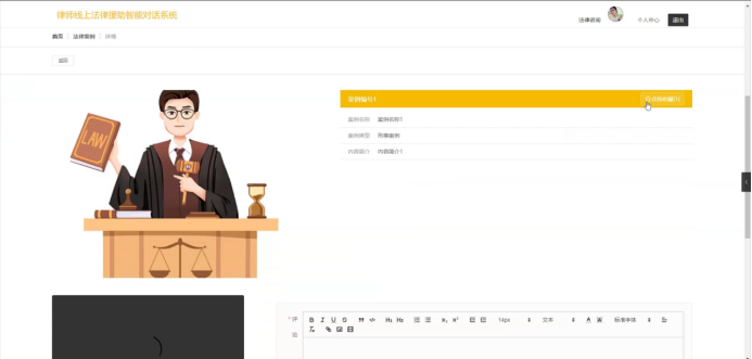 法律案例:在法律案例页面的输入栏中输入案例编号和案例名称进行查询,可以查看到法律案例详细信息,并进行评论或收藏操作;法律案例页面如图5-6所示: