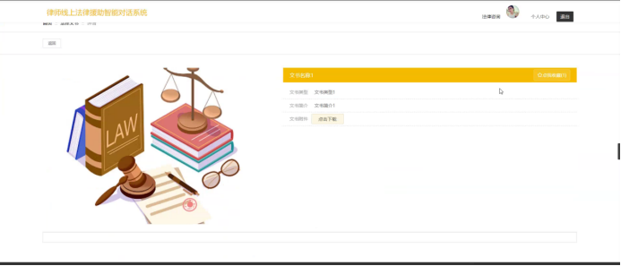 法律文书:在法律文书页面的输入栏中输入文书名称和文书类型进行查询,可以查看到法律文书详细信息,并进行收藏操作;法律文书页面如图5-5所示:
