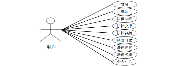 用户:用户进入系统前台可以对首页、律师、法律知识、法律文书、法律案例、风险评估、法律新闻、法律咨询、个人中心等信息进行操作。用户用例如图3-3所示。