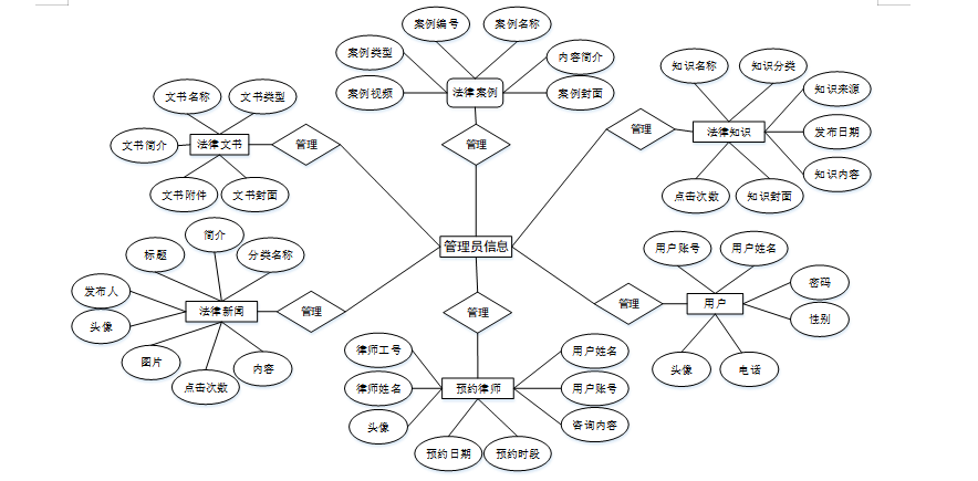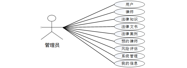 管理员模块:管理员是系统中的核心用户,管理员登录后,可以对后台系统进行管理。主要功能有用户、律师、法律知识、法律文书、法律案例、预约律师、风险评估、系统管理、我的信息等功能。管理员用例如图3-1所示。