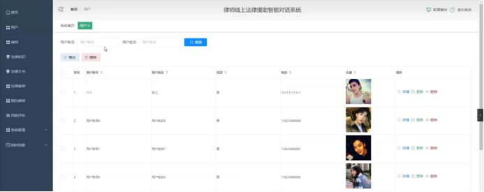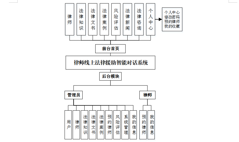 律师线上法律援助智能对话系统主要有管理员、律师和用户三个功能模块。以下将对这三个功能的作用进行详细的剖析。