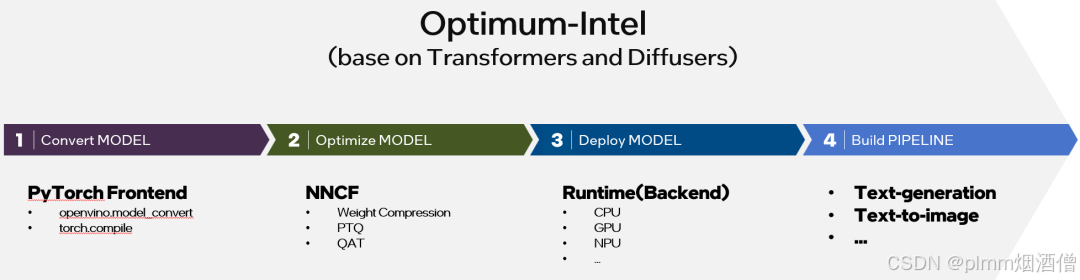 Optimum是专门用于模型转换和量化的套件,它是 Hugging Face 推出的开源库。Optimum支持多种硬件平台,其中就包括 Intel 平台 Optimum-Intel:通过OpenVINO、Intel Neural Compressor、IPEX等工具优化。