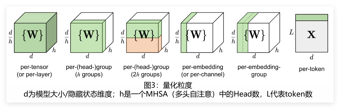 - 常见的有per-tensor(逐层量化)、per-channel/per-token(逐通道/逐token量化)、per-group(逐组量化)。