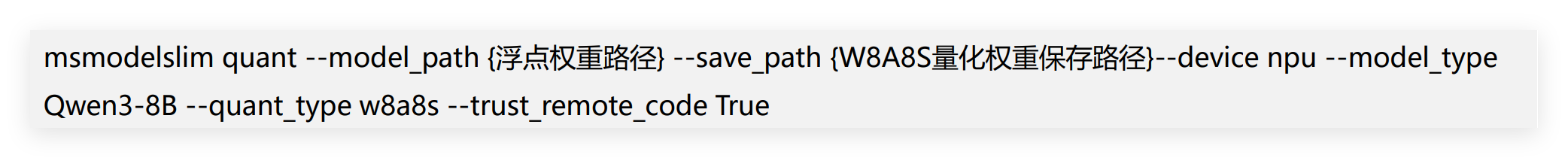 msmodelslim quant --model_path {浮点模型路径} --save_path {量化模型保存路径} --device npu --model_type Qwen3-32B --config_path ${msmodelslim量化工具安装路径}/msit/msmodelslim/msmodelslim/practice_lab/Qwen/qwen3dense-w8a8.yaml --trust_remote_code True