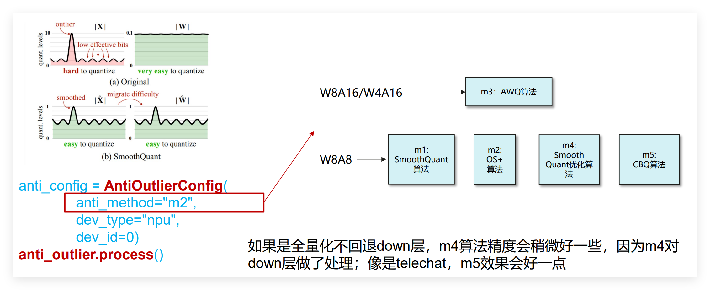 - 离群值抑制:模型参数中偶尔会出现一些极端值,这些值会导致量化误差增大。常用的抑制算法有SmoothQuant、AWQ、Flex Smooth等,比如W8A8量化常用m4(Smooth Quant)算法,W8A16量化常用m3(AWQ)算法。