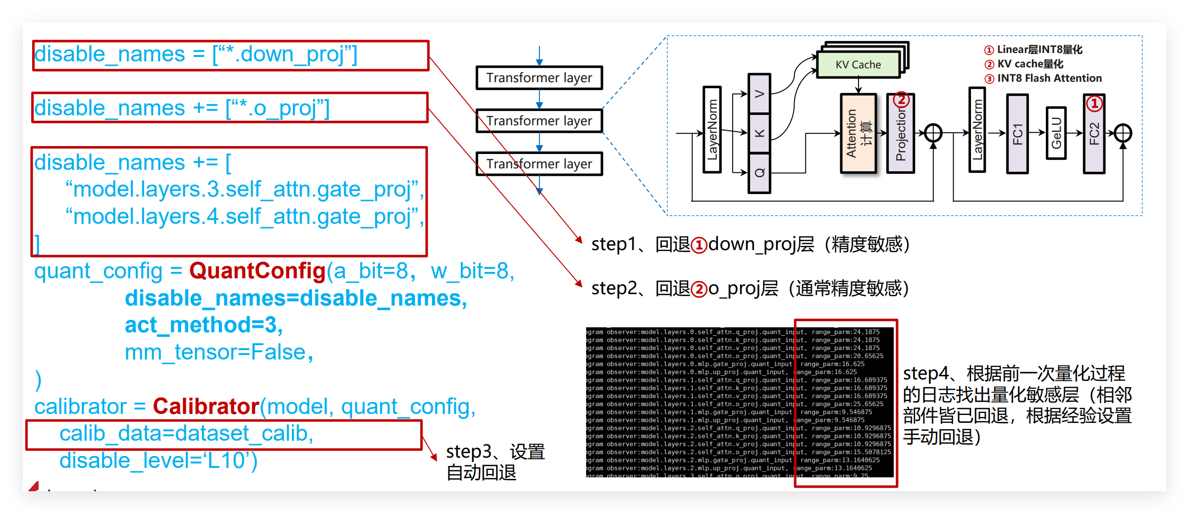 - 手动回退(disable_names):按经验指定高精度层,优先回退down_proj层、o_proj层,再依据终端日志range_parm数值筛选其他敏感层;