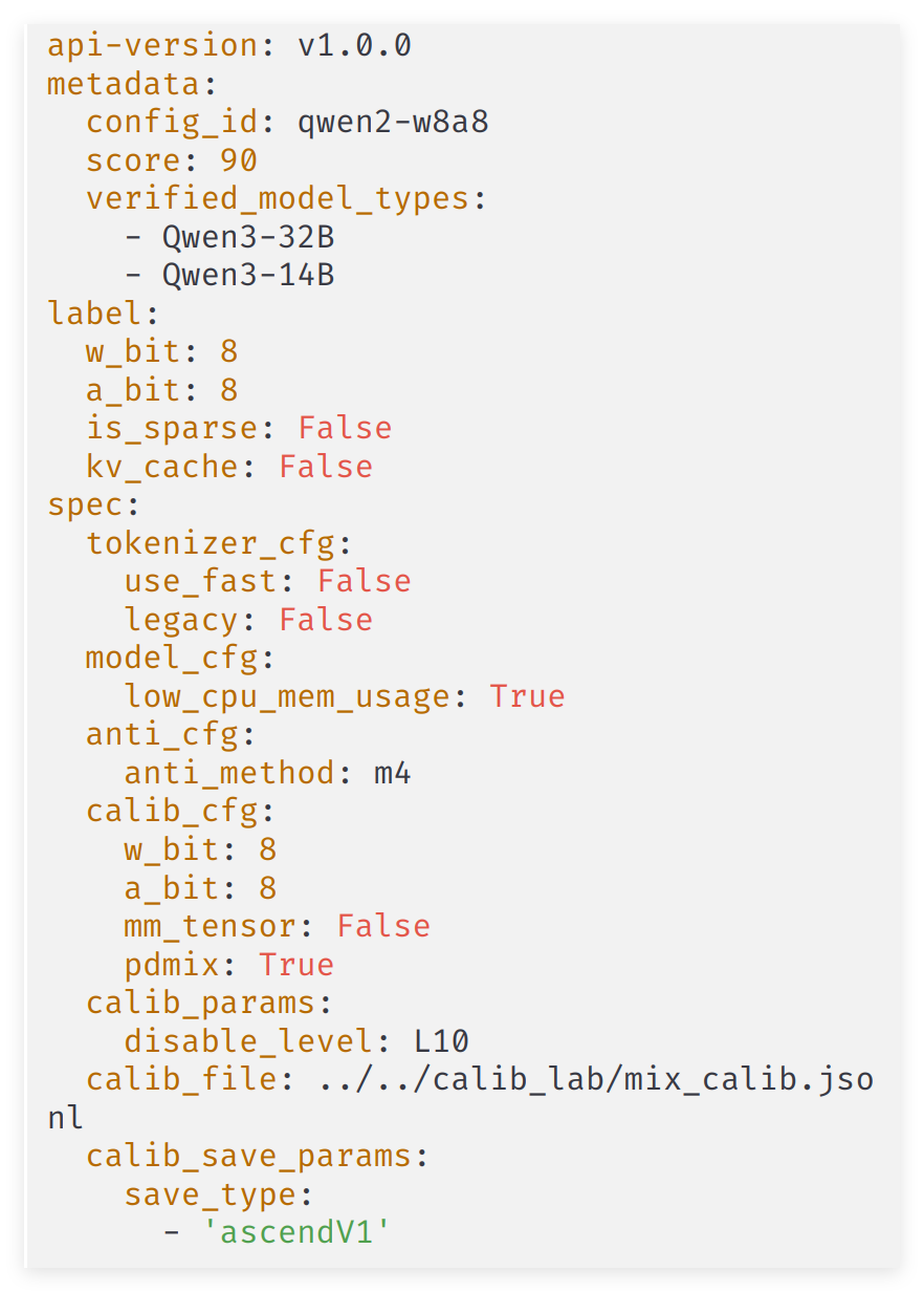量化配置文件(qwen3dense-w8a8.yaml)里的关键参数也需要留意: