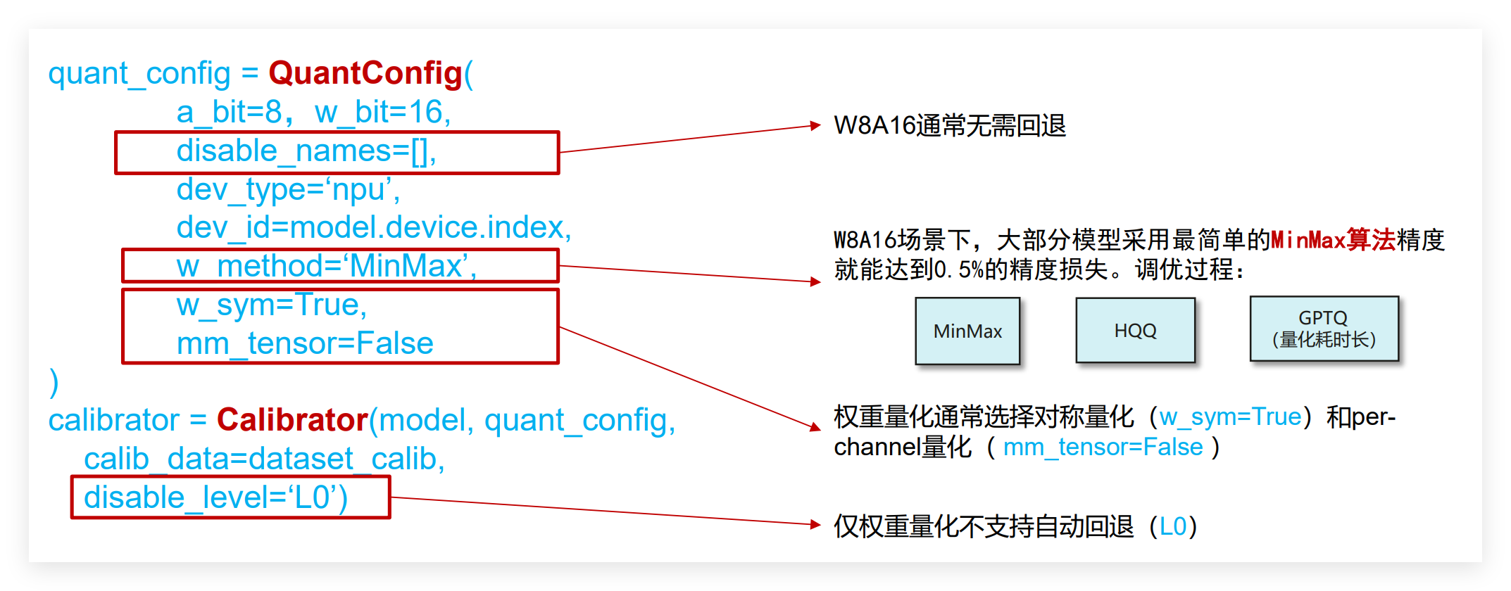 | W8A16(8-bit Weight, 16-bit Activation) | 权重量化为INT8,激活值保留FP16 | 精度优先,性能折中 | 复杂图像处理、高精度NLP任务 |
