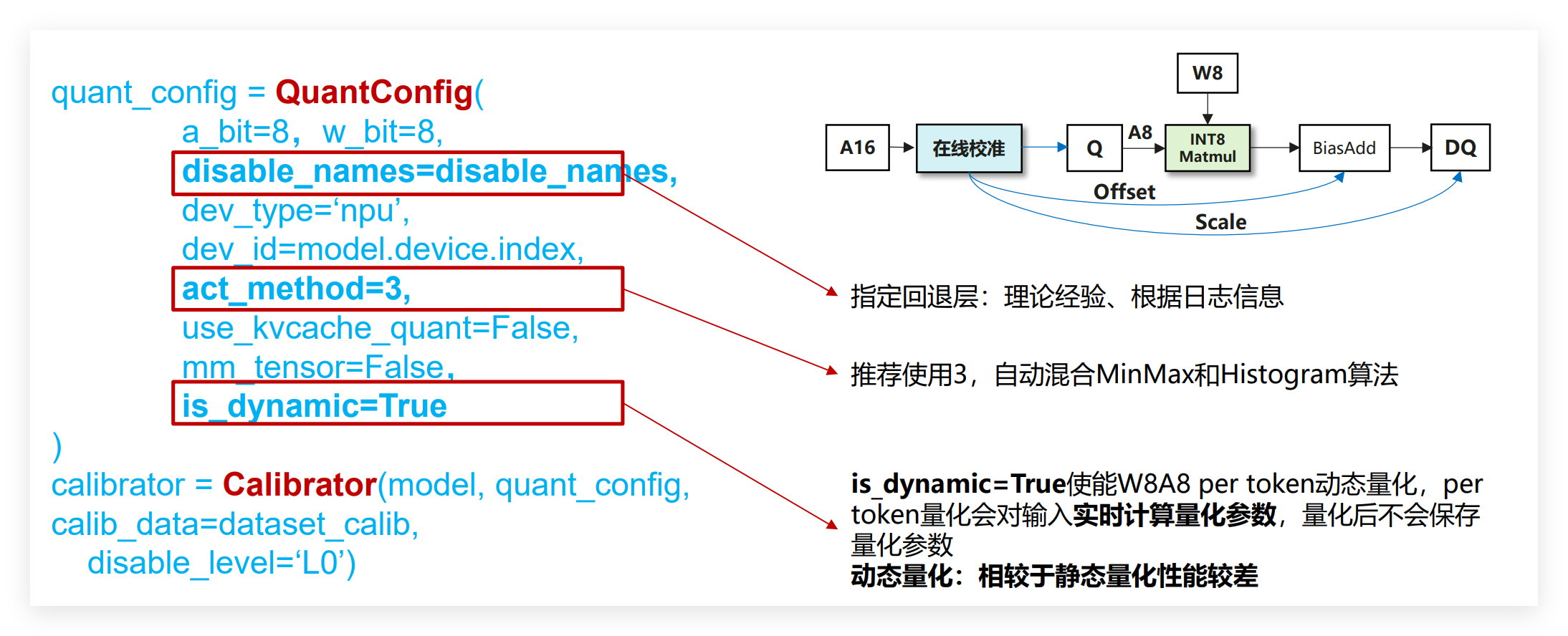 在实际使用中,W8A8量化还有一些实用的优化策略。比如支持W8A8_mix模式,在Prefill阶段用激活值per-token量化(保证高精度),在Decode阶段用per-tensor量化(提升高性能),这样就能兼顾推理性能和精度。