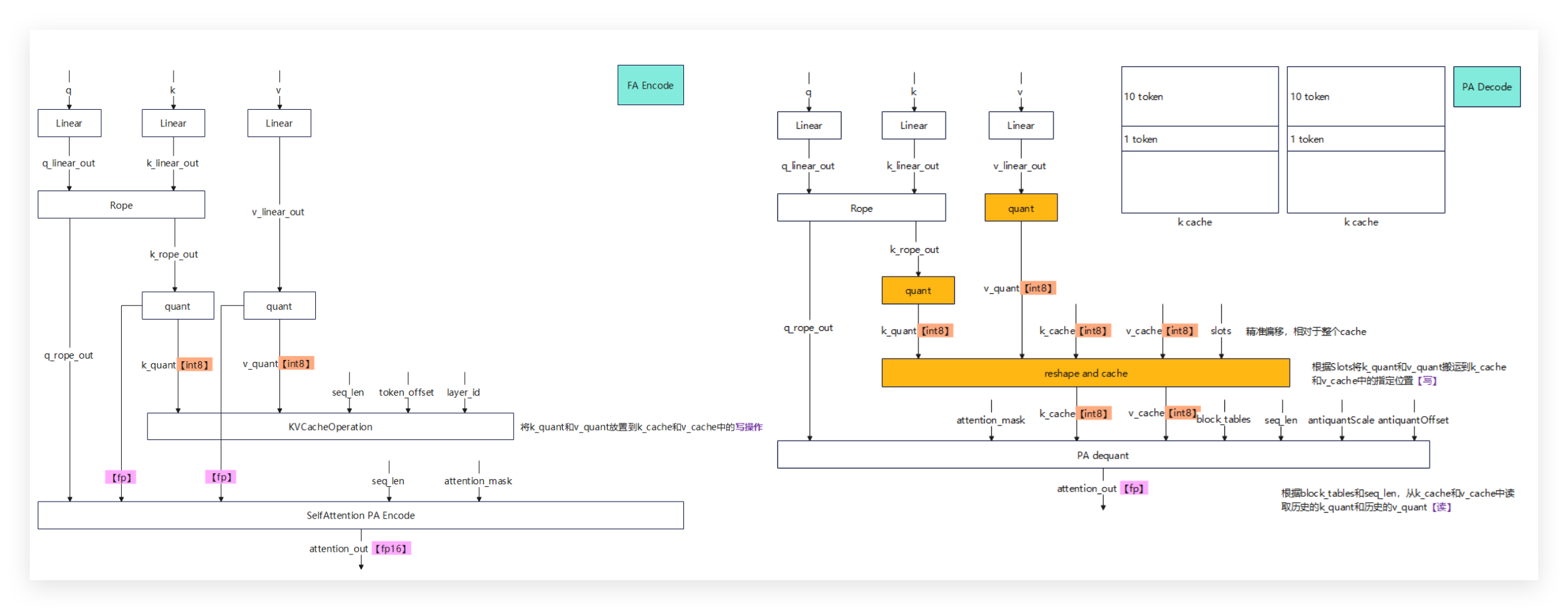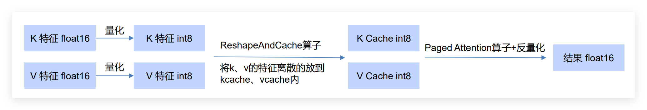 它的技术原理很直观:把K、V特征量化成INT8类型存储在缓存中,推理时通过Paged Attention算子反量化后再计算,这样既能保证精度,又能提升缓存效率。