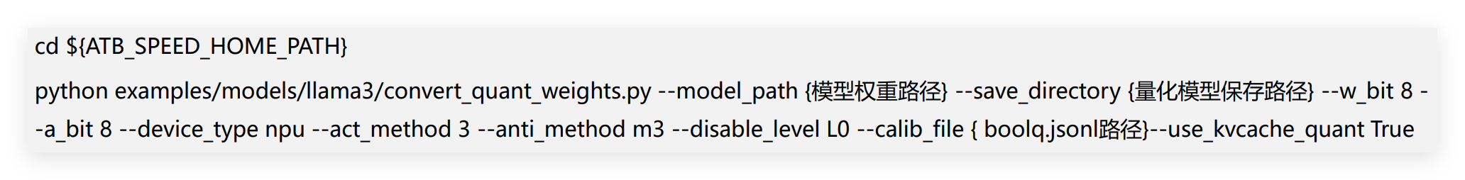 - 生成量化权重:安装好msModelSlim工具后,执行下面的指令就能生成W8A8 mix类型的量化权重: