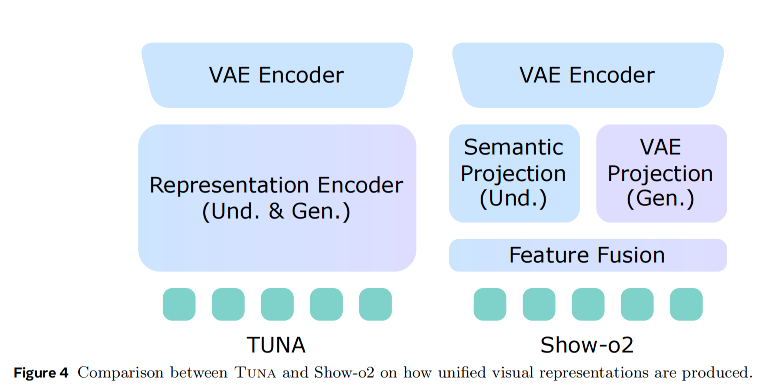 Tuna的核心思路是:先利用VAE编码器捕捉图像/视频的细节信息,再通过一个语义表示编码器从中提炼出高层语义特征,两者融合形成一个既包含细节又富含语义的统一表示。