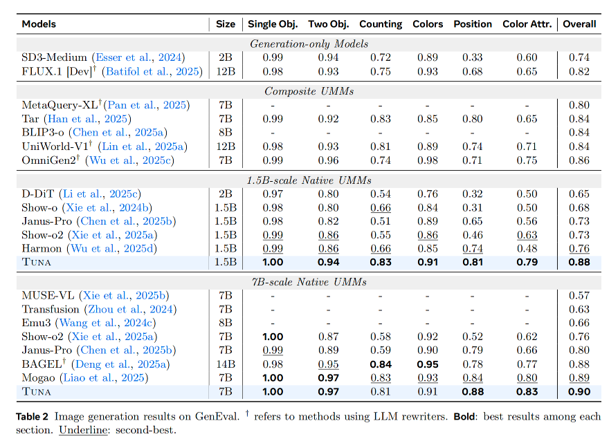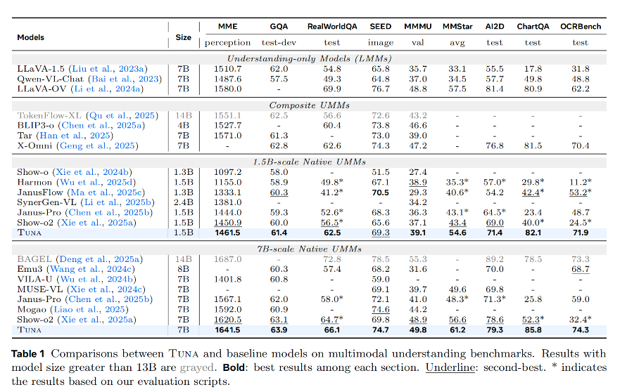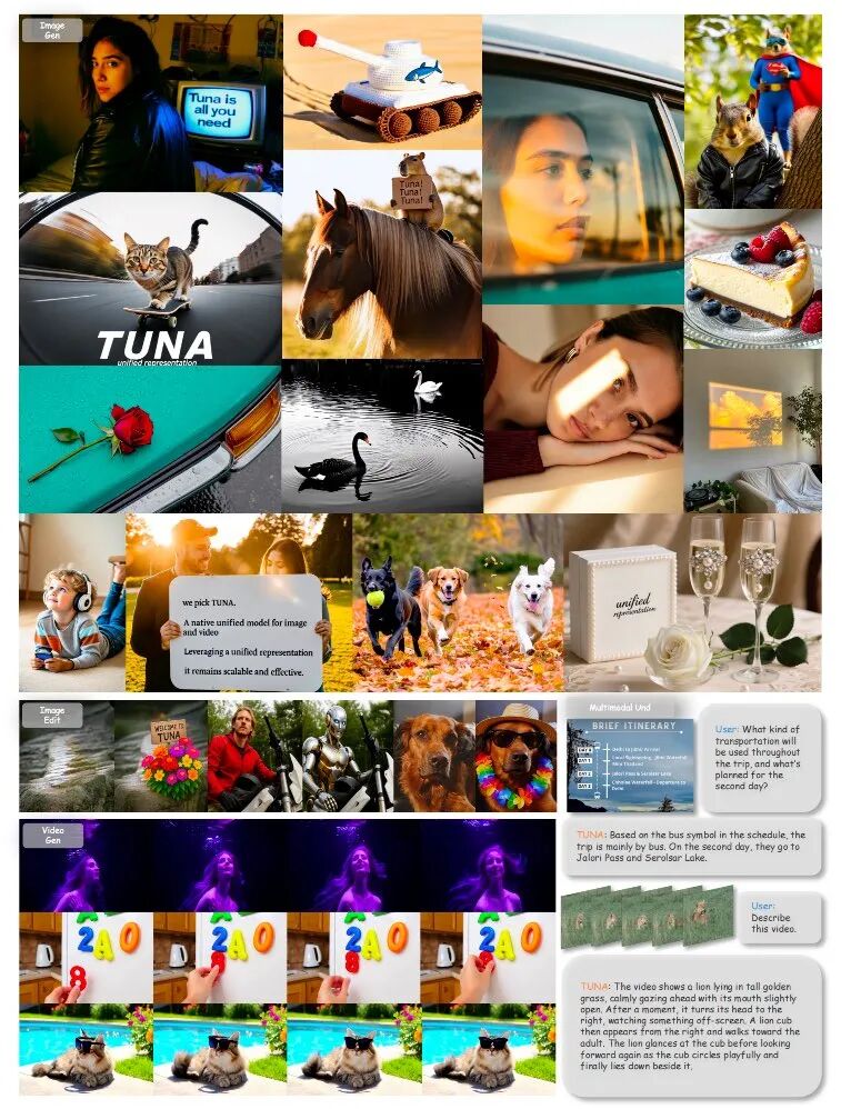 - 进行了全面的性能验证:在涵盖图像/视频理解、生成及编辑的广泛基准测试中,Tuna均取得了最先进(SOTA)或极具竞争力的结果,证明了统一表示的有效性。