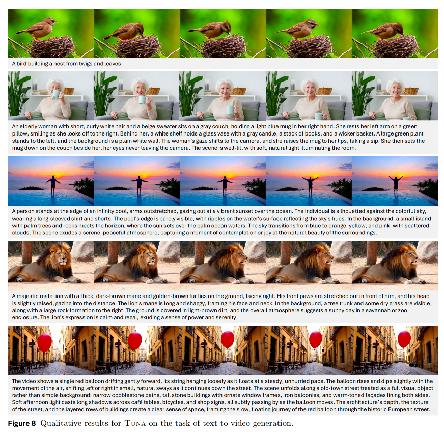 展示了Tuna根据复杂文本描述生成高质量、连贯视频的能力。