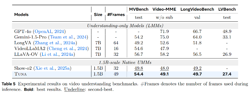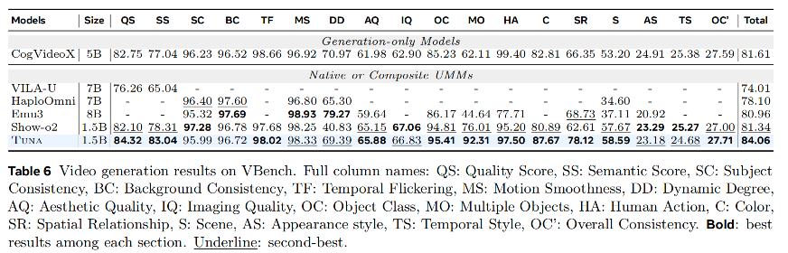 在MVBench等视频理解任务上,Tuna优于Show-o2等模型。在VBench视频生成评测中,仅用1.5B参数的Tuna取得了所有UMMs中的最佳成绩。