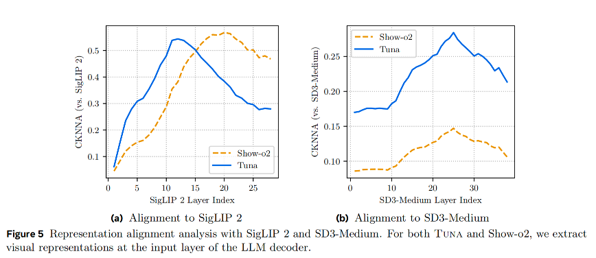 - 与Show-o2对比:Tuna的统一表示(模型9-13)在不同配置下均优于采用晚融合(Late-fusion) 策略的Show-o2(模型7)。分析(图4,5)表明Show-o2的表示偏向语义理解,而Tuna的表示更平衡,利于生成。