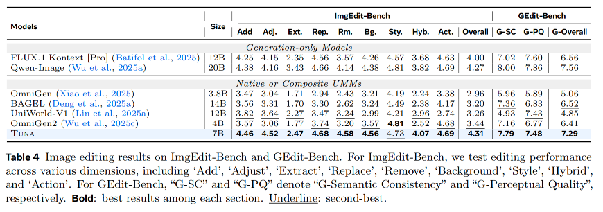 在ImgEdit-Bench和GEdit-Bench上,Tuna在所有UMMs中排名第一,并与顶尖的纯生成模型表现相当。