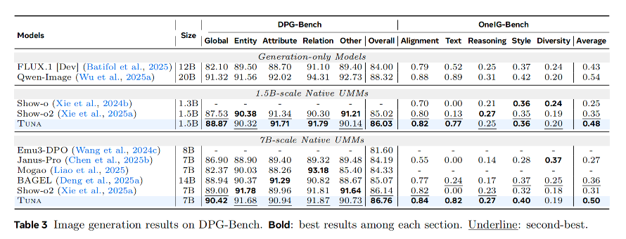 在GenEval、DPG-Bench和OneIG-Bench上,Tuna全面领先于其他UMMs,在文本渲染等需要精确语义理解的子任务上优势明显。
