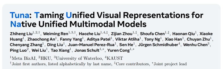 - 论文标题:Tuna: Taming Unified Visual Representations for Native Unified Multimodal Models