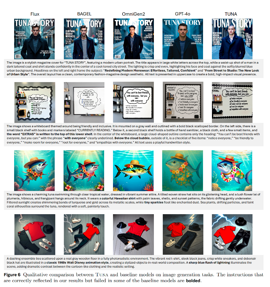 Tuna在生成包含复杂文本和多个物体的图像时,显示出更精确的提示跟随和构图能力。