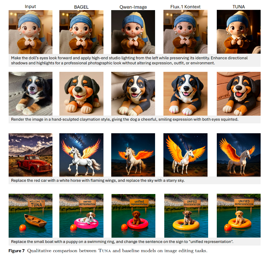 Tuna能准确执行风格转换、环境变化、物体替换等编辑指令,并理解“左侧光照”等隐式要求。