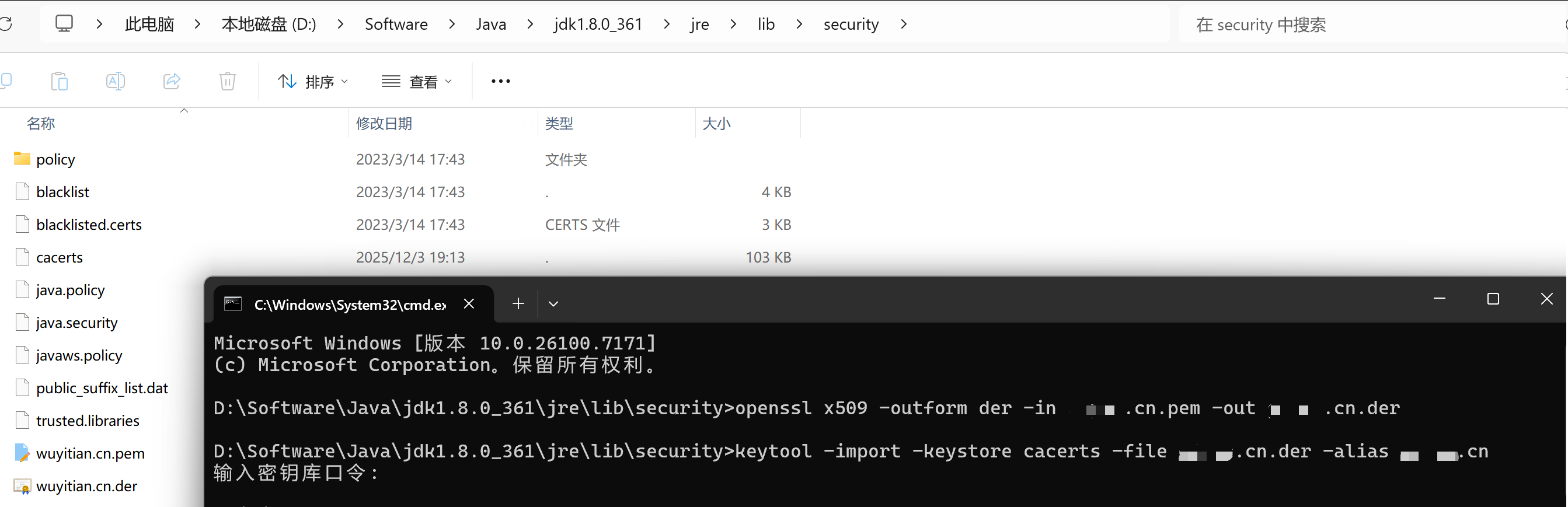 keytool -import -keystore cacerts -file wuyitian.cn.der -alias wuyitian.cn
