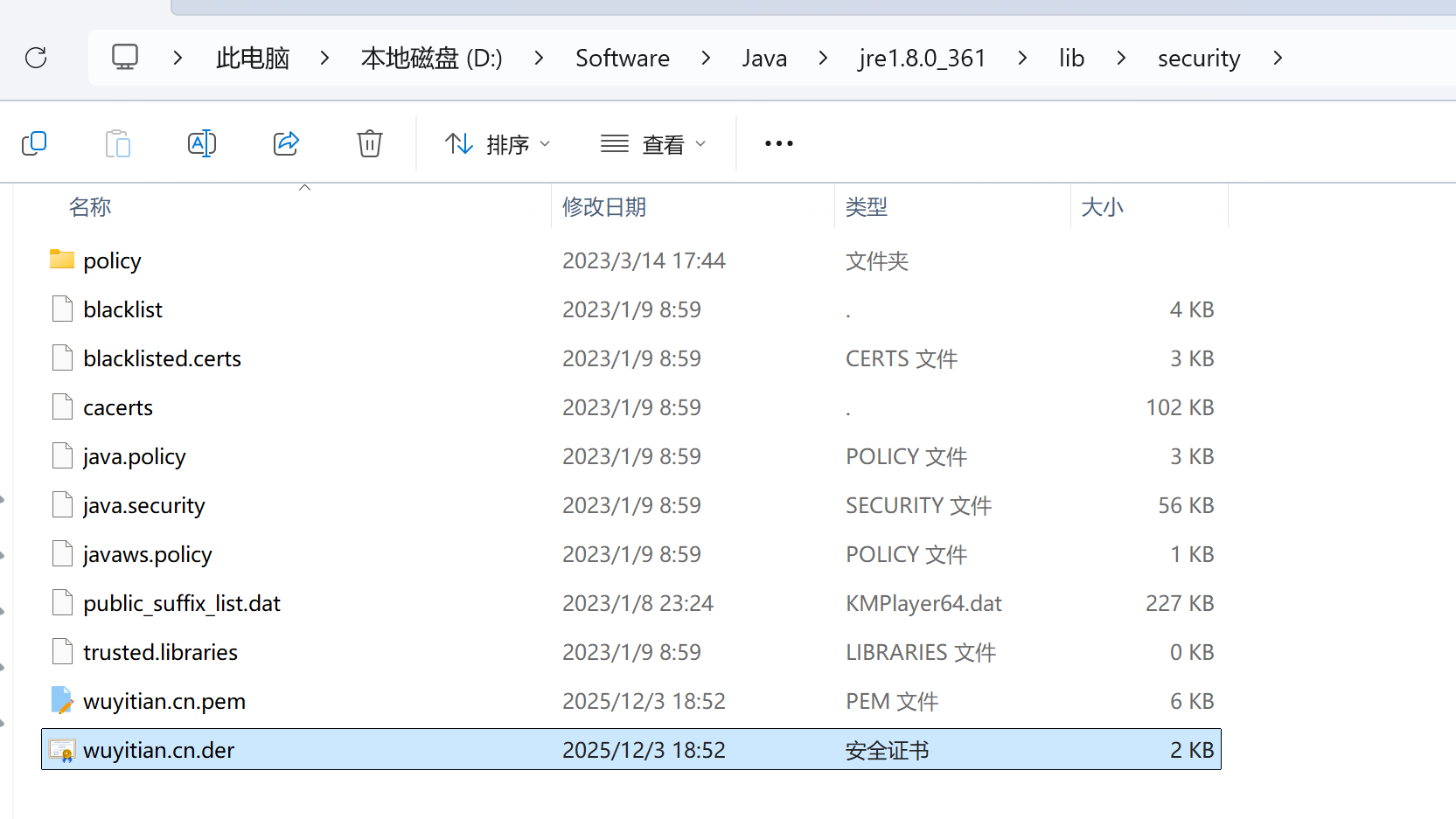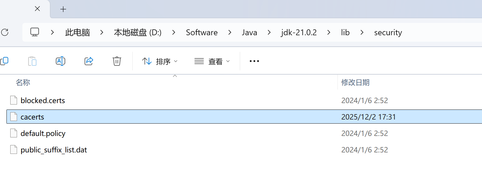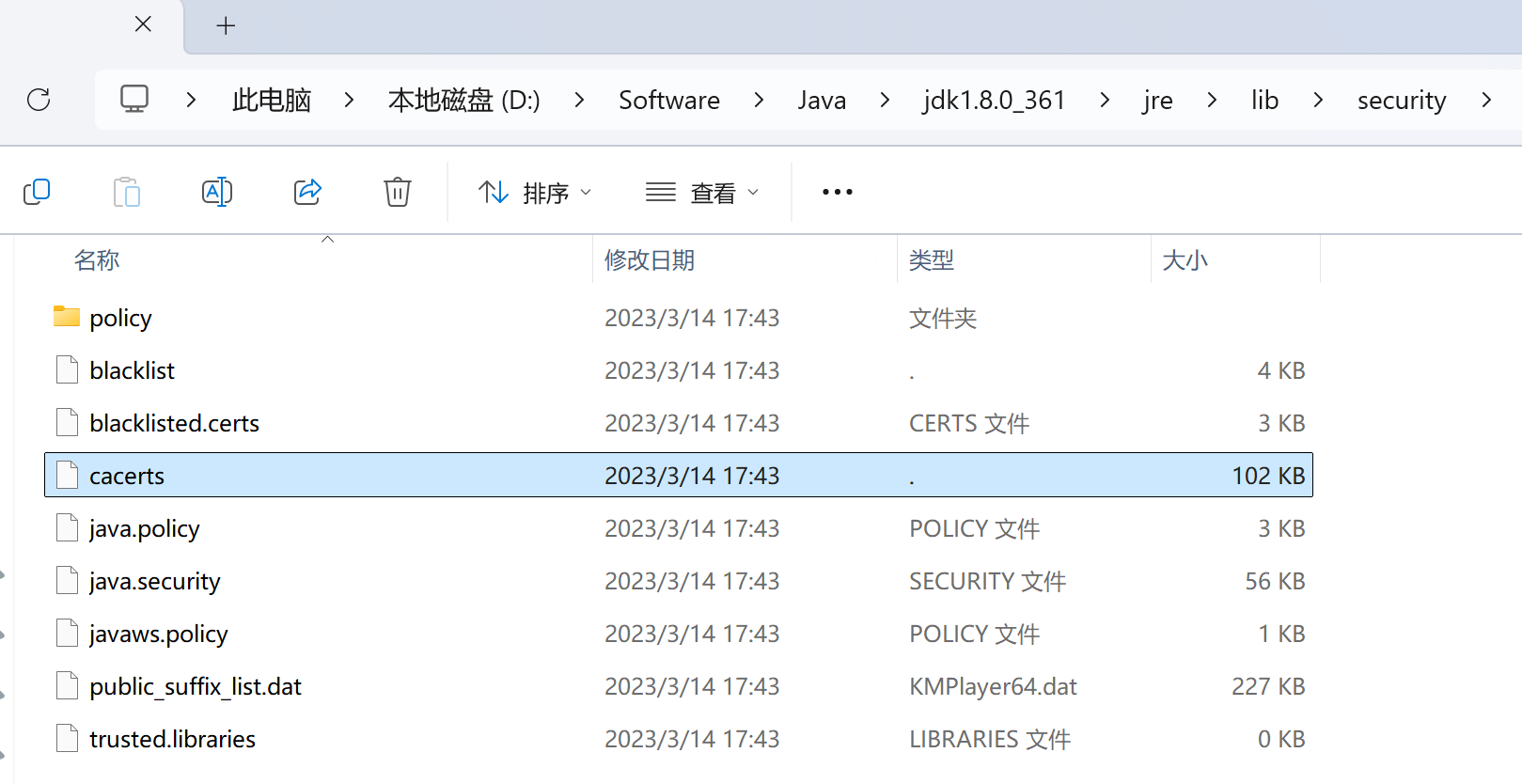 通常情况下Java8的证书路径和上面一样的,不过我的电脑不知道为何是在 jre\lib\security,这里也记录一下。