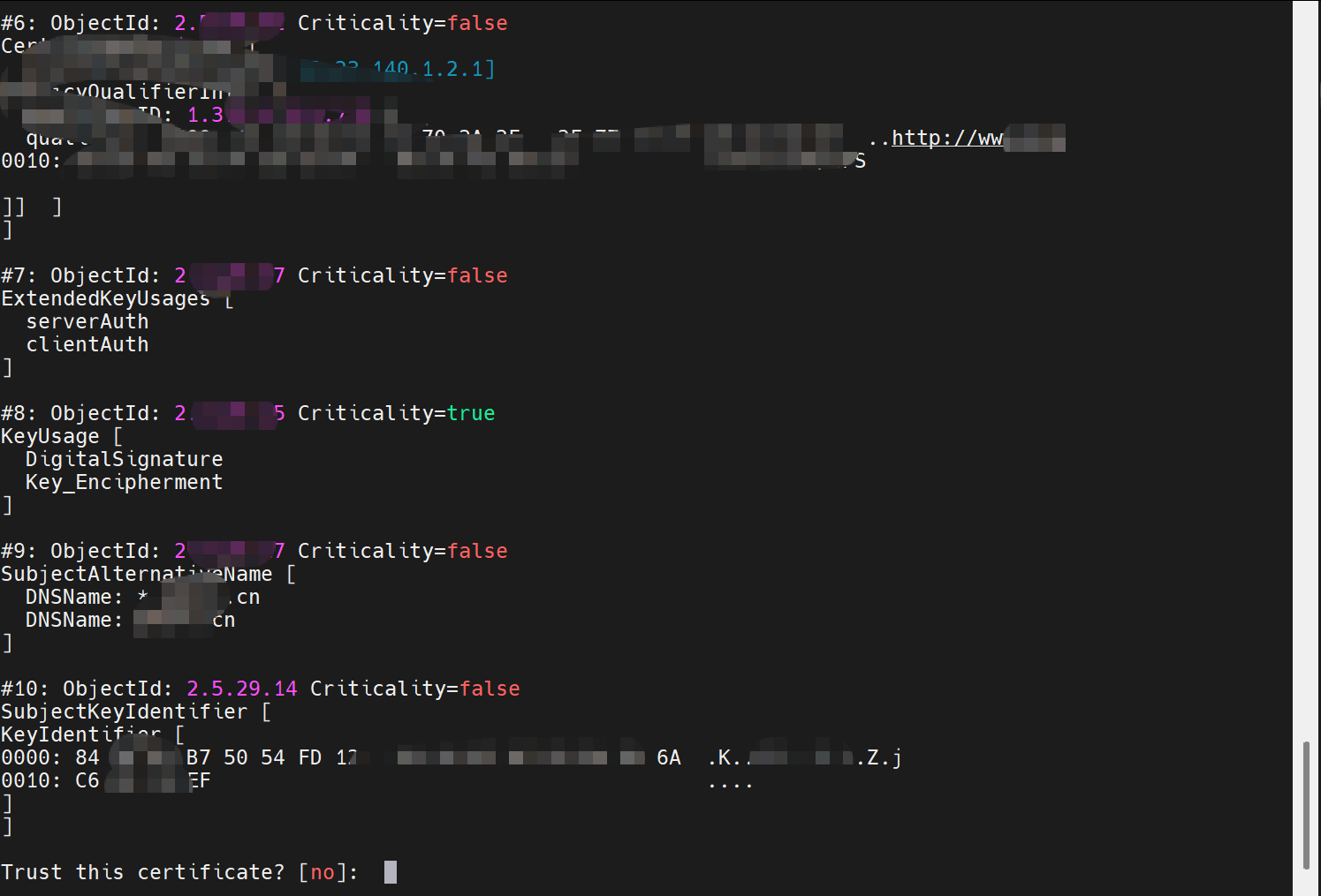 最后会有一个提示,是否信任这个证书,我们需要输入:yes