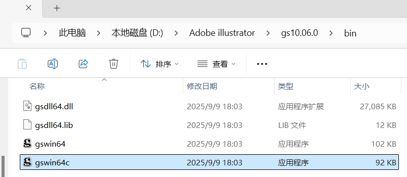 此时我们点击“确定”,手动定位 gswin64c.exe 的安装路径。gswin64c.exe 的位置在Ghostscript安装文件夹的bin文件夹下,如我的文件在D:\Adobe illustrator\gs10.06.0\bin\gswin64c.exe